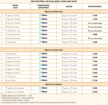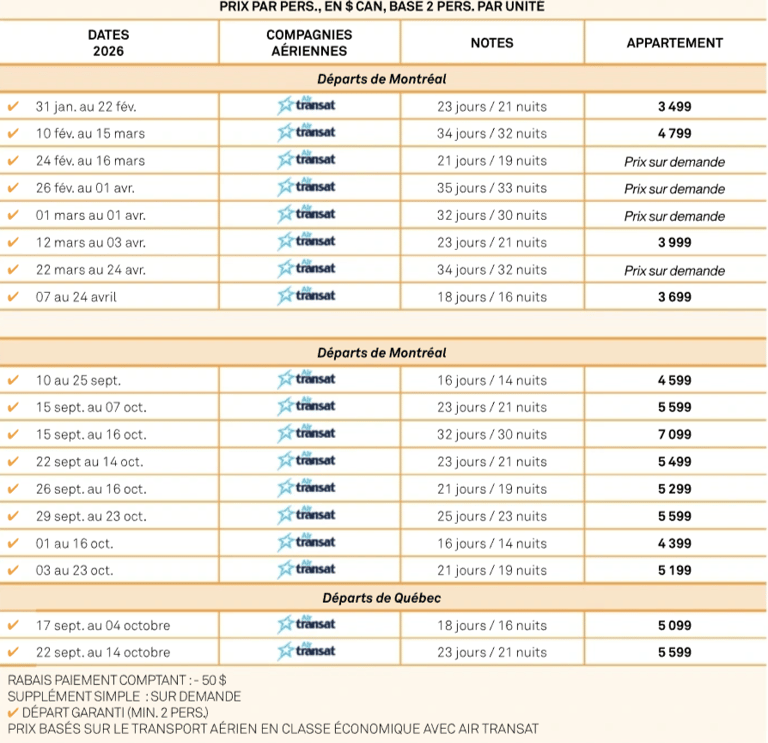 Dépôt de 500$ par personne requis au moment de la réservation, paiement final 60 jours avant le départ