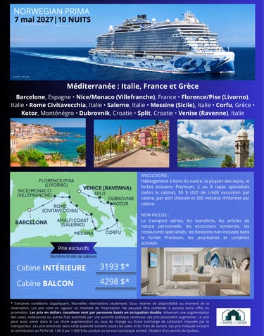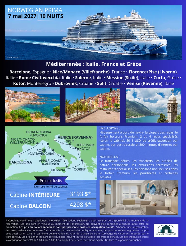Une croisière d’exception en Méditerranée à bord du Norwegian Prima, 10 nuits pour découvrir l’Italie, la France et la Grèce, avec confort, gastronomie et escales emblématiques.