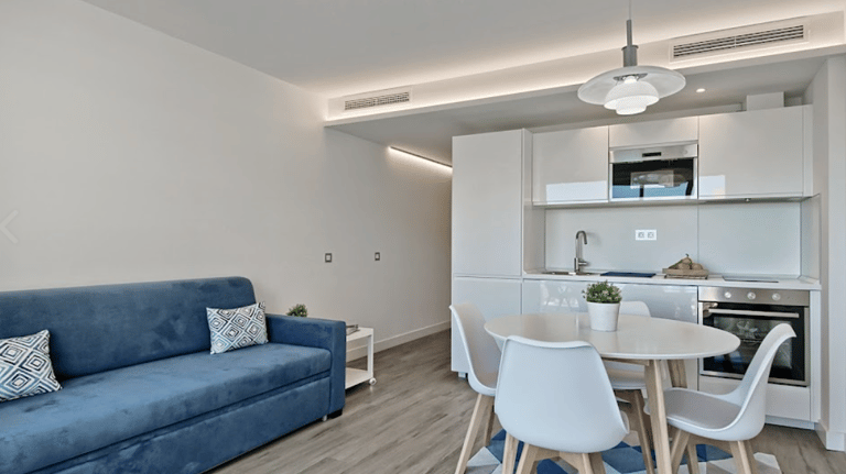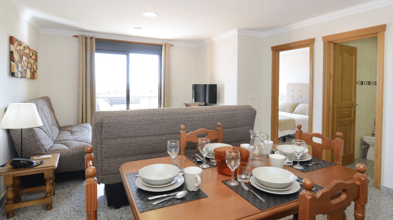 Appartements spacieux avec cuisine équipée (incluant lave-linge, micro-ondes, réfrigérateur et vaisselle), salon avec coin repas, balcon ou terrasse, climatisation, télévision, Wi-Fi gratuit et salle de bain complète. Les logements peuvent accueillir de 2 à 4 personnes selon la configuration.