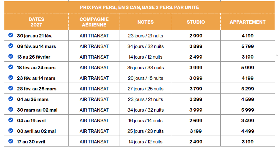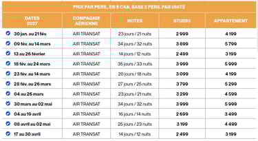 Multiples départs possibles de janvier à mai 2027. La durée varie d'un départ à l'autre pour plus de flexibilité. Consultez la grille des départs et tarifs ci-bas.
