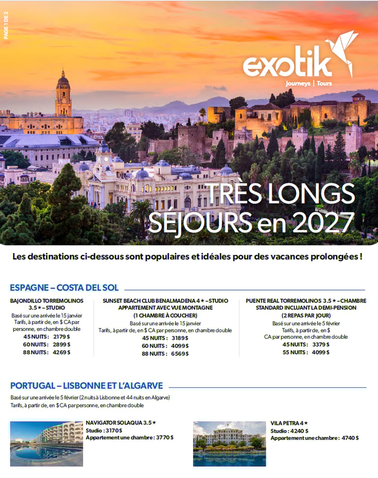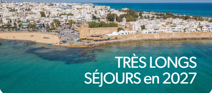 Profitez de séjours prolongés dans ces hôtels sélectionnés pour 2027 et découvrez le confort et la détente à votre rythme. Choisissez parmi 3 hôtels en Espagne sur la Costa del Sol, 2 hôtels au Portugal, incluant 2 nuits à Lisbonne et le reste du séjour en Algarve, ou 3 hôtels en Tunisie à Sousse, pour des séjours de 45, 60 ou 88 nuits. Une façon unique de combiner vacances et immersion totale dans votre destination favorite !