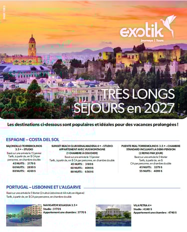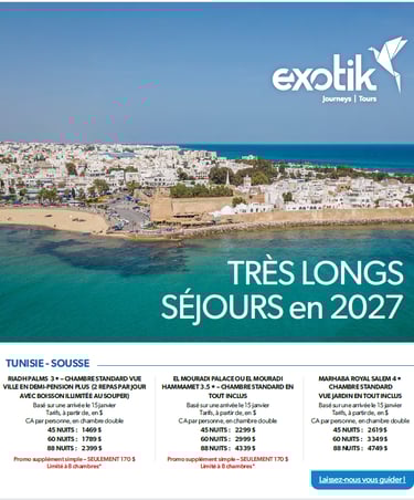Découvrez nos très longs séjours offerts par Exotic Tours! Profitez de séjours de 45, 60 ou 88 nuits dans nos hôtels sélectionnés pour 2027 et découvrez le confort et la détente à votre rythme.